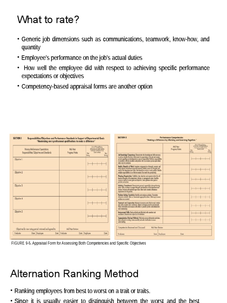 Performance appraisal tools include the graphic rating scale, alternation ranking method, forced distribution method, BARS, MBO, critical incident method, and computer and Webbased methods Appraisal problems to beware of include unclear standards, halo effect, central tendency, leniency or strictness problems, and biasAlternation ranking method Ranking employees from best to worst on a particular trait, choosing highest, then lowest, until all are ranked;Essay Performance Appraisal method Essay Appraisal is a traditional form of Appraisal also known as "Free Form method" It involves a description of the performance of an employee by his superior which needs to be based on facts and often includes examples to support the information